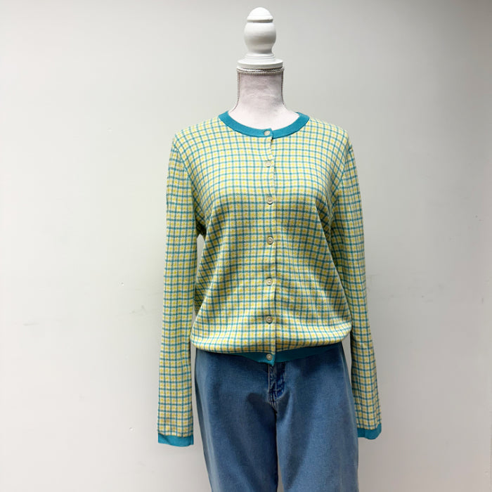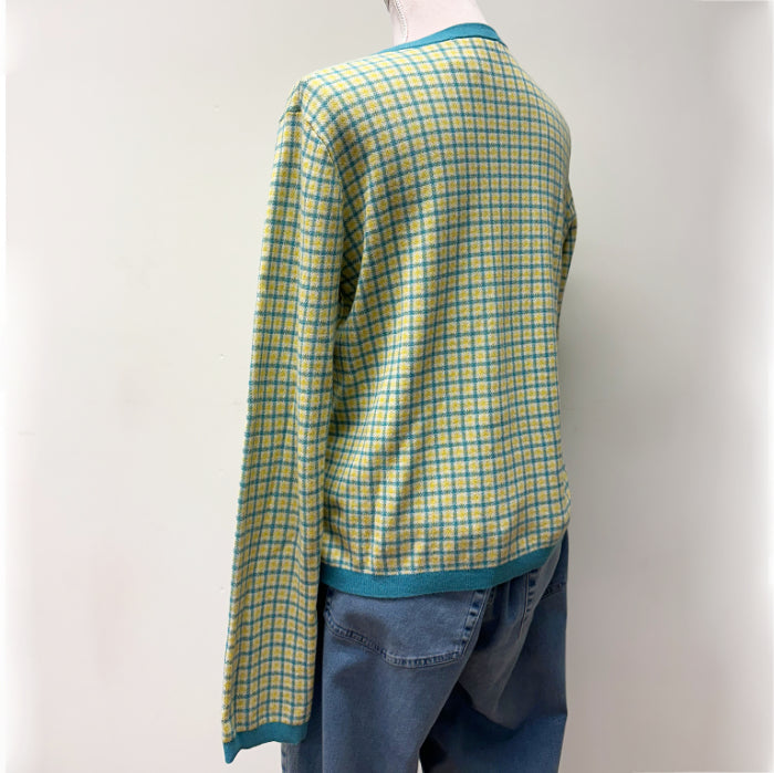 Uniqlon yhteistyömallistoa oleva kiva pastelliruutuinen jakardi-neuletakki, jossa sinivihreää, keltaista ja valkoista. Joustava ja hyvälaatuinen neulos.