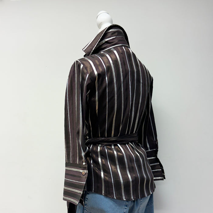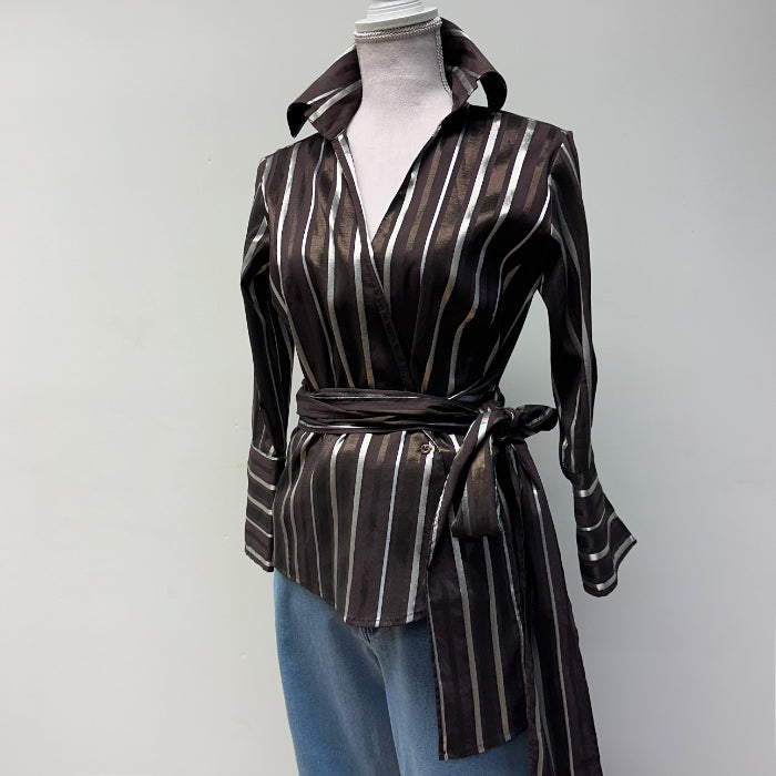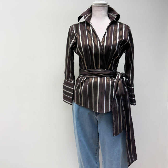 Zara Basic, ruskeasävyinen juhlavampi paitapusero, jossa kullansävyiset pystyraidat. Kolme pientä nappia edessä, kummassakin hihassa 1 nappi.