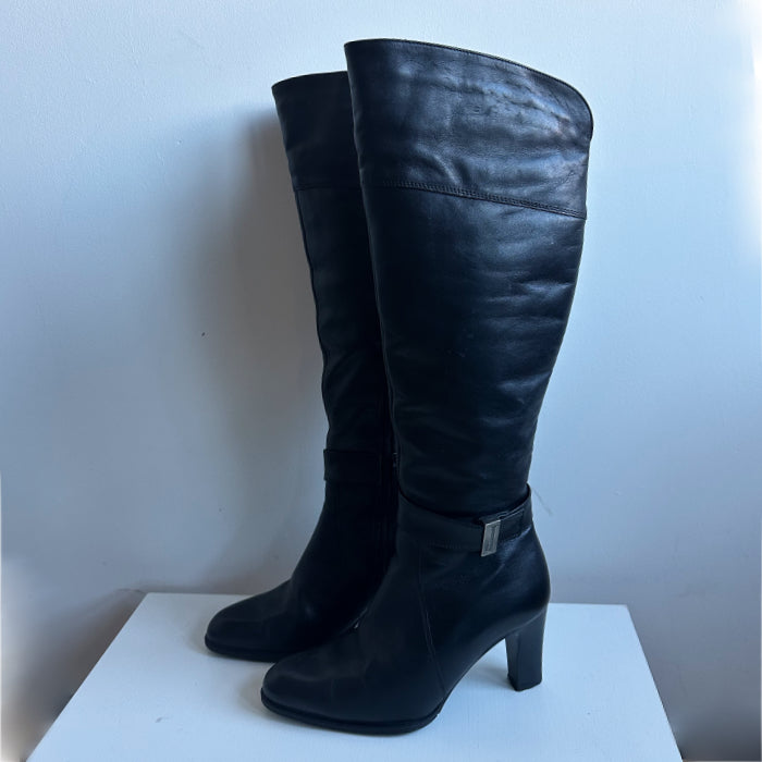 Upeat suomalaiset polvipituiset Janita-merkin saapikkaat. Mustien saapikkaiden sisäpuolella on pehmeä keinoturkis. Sisäsivussa lyhyt vetoketju.
