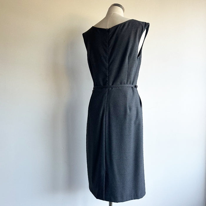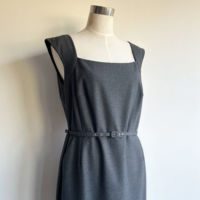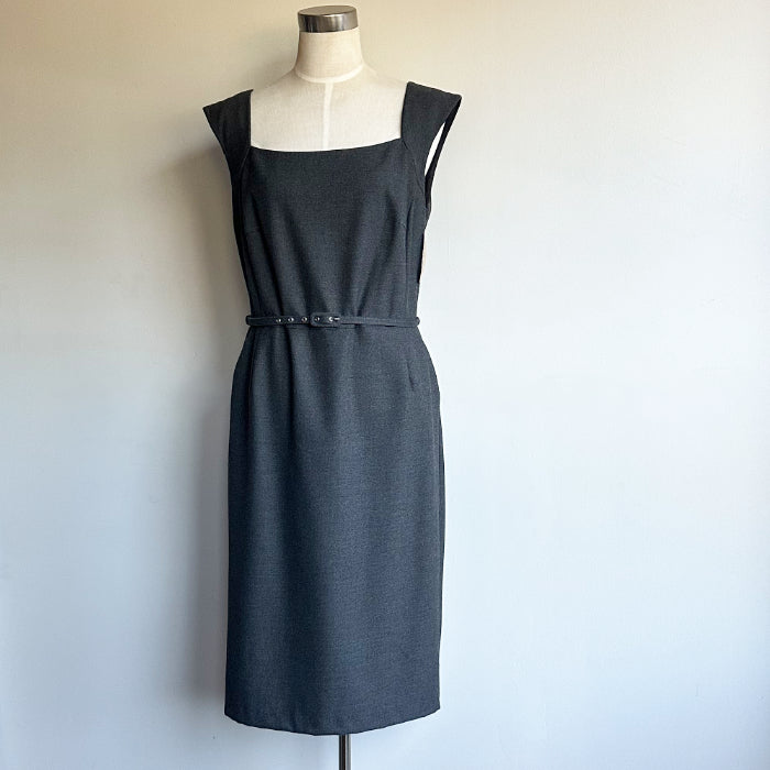 Laura Ashley Essentials -malliston harmaa kotelomekko, jossa taskut ja irrotettava vyö. Takana vetoketju ja lyhyt halkio. Mekossa on vuori.