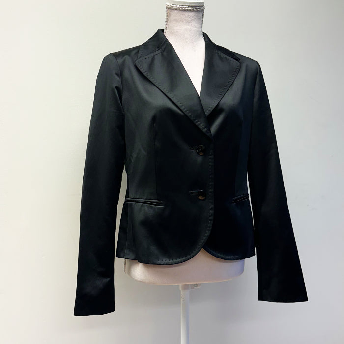 Musta kiiltäväpintainen jakku. Edessä valetaskut ja kaksi nappia.