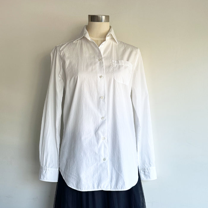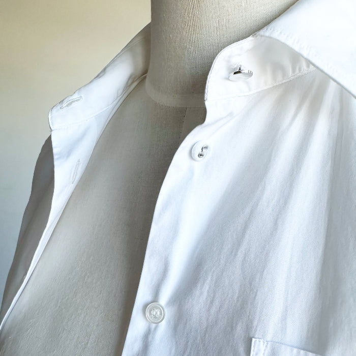 Valkoinen, laadukas paitapusero. Paidassa on kolmea erilaista nappityyppiä: hopean väriset napit kauluksessa ja hihansuissa, yksi valkoinen kangaspäällysteinen nappi toiseksi ylimpänä, muut napit ovat weekend-tekstillä olevia pieniä vaaleita, läpikuultavia nappeja.