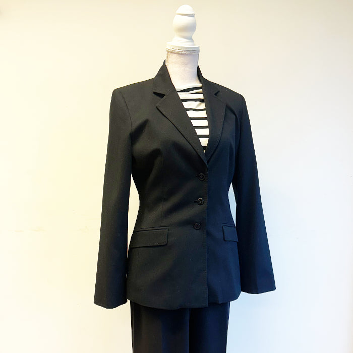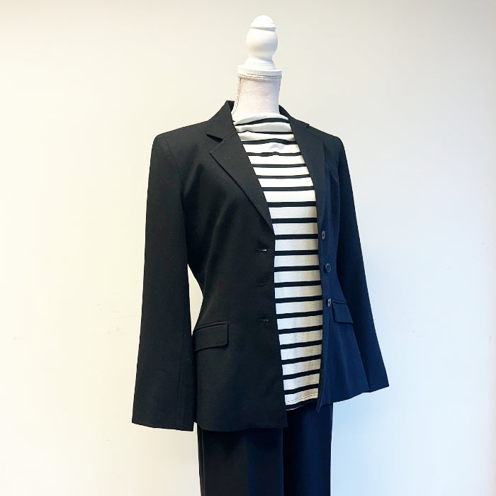 Musta bleiseri, jossa olkatoppaukset; leveähkö hartialinja, muuten kapealinjainen, kolme nappia. Bleiserissä on vuori.