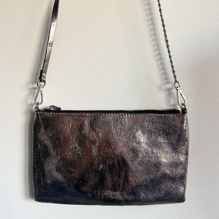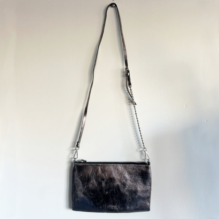 Kiva, litteä iltalaukku, jossa säädettävä ja irrotettava hihna. Vetoketjulla suljettava. Hopeanväriset metalliosat. Laukussa on vuori.