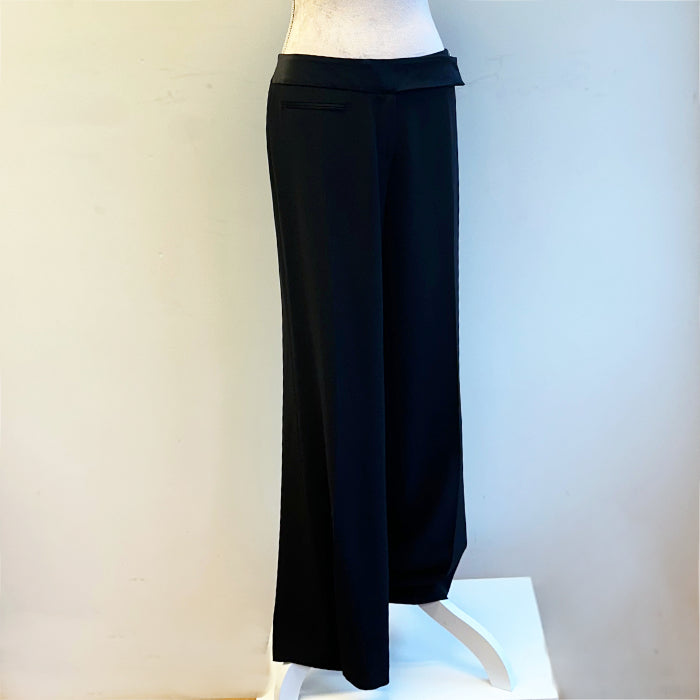 Juhlaankin sopivat kauniisti laskeutuvat, leveälahkeiset housut, joissa satiinivyötärö. Vetoketju, piilonappi ja hakaskiinnitys. Matala vyötärö ja prässätyt lahkeet. Edessä koristetasku.