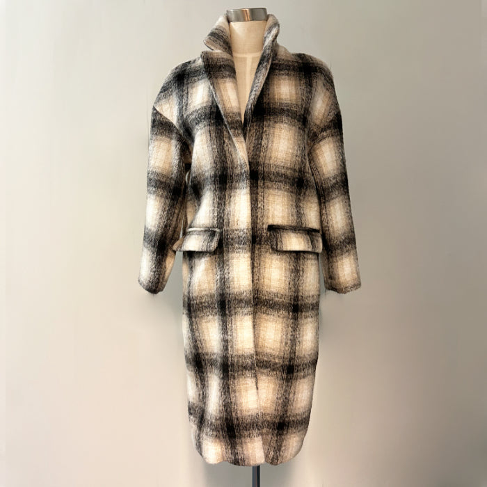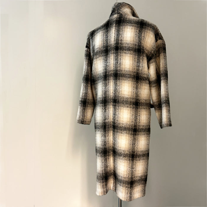 Vuoriton H&M pitkä ruututakki. Takissa kaksi painonappia ja taskut.