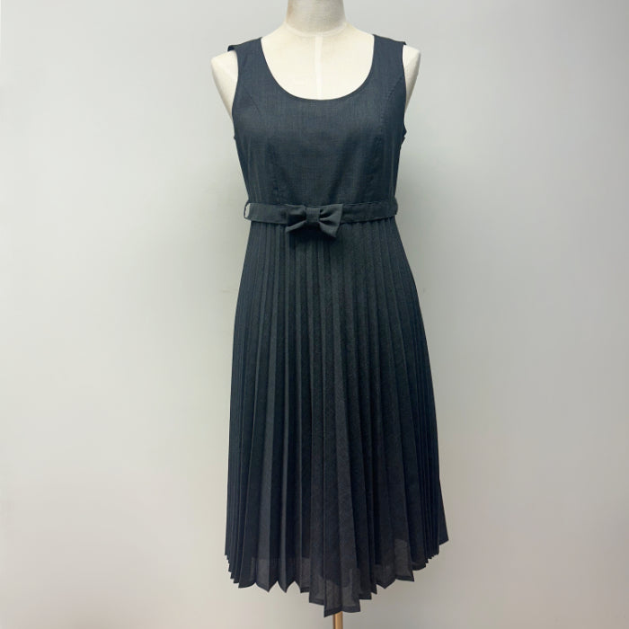 Kaunis harmaa mekko, jossa pliseerattu helma. Mekossa on irrotettava rusettivyö, vuori ja sivussa vetoketju.
