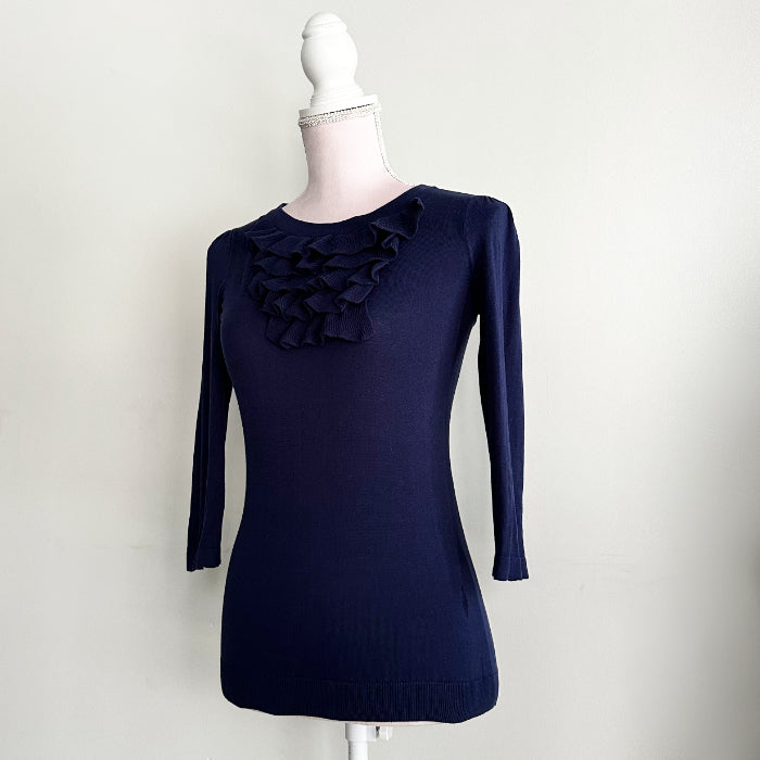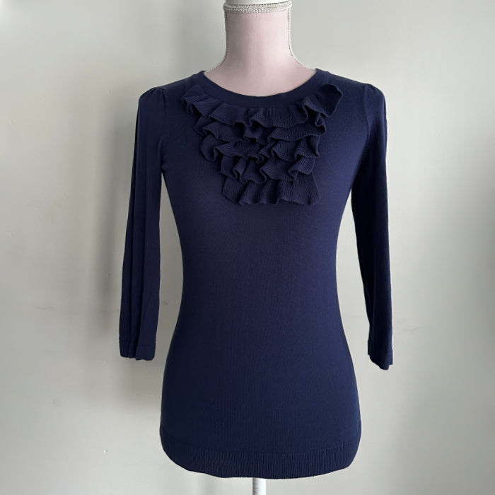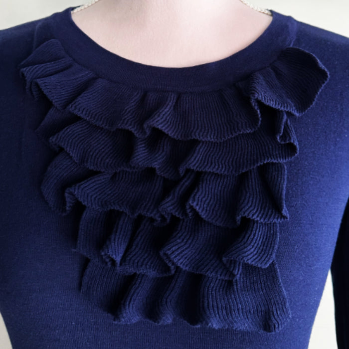 Puserossa on vajaamittaiset hihat ja trendikäs röyhelömäinen neuloskoriste etuosassa.