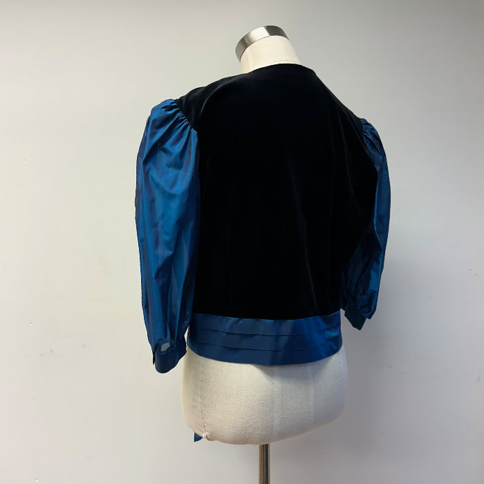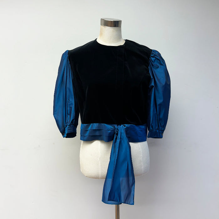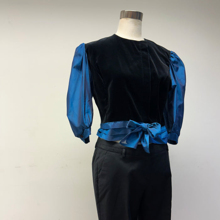 Empereia-juhlapusero, jossa mustaa samettia ja petroolin väristä kiiltäväpintaista kangasta. Nappikiinnitys; piilonappilista. Hihansuissa napit.