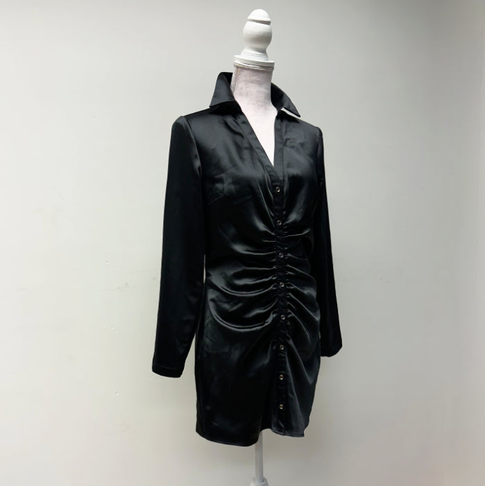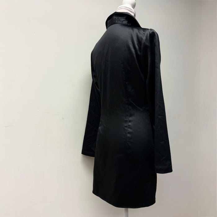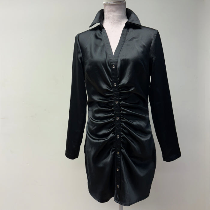 Kiva pitkähihainen, joustava satiinimekko, jossa vetoketju kyljessä ja koristenappirivi edessä.
